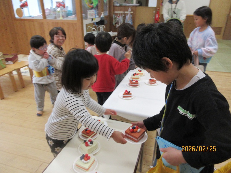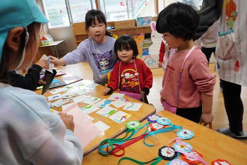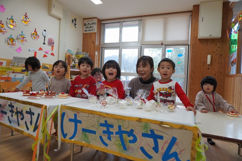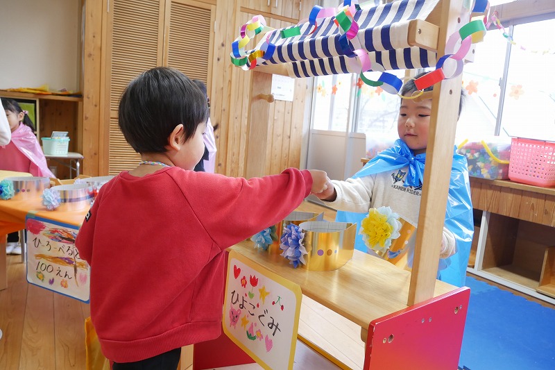 「いらっしゃいませー」子ども達のにぎやかな声が聞こえてきます。各クラス自慢の商品が並んでいます。年長児は「ふれあいびろば」と名付けてあそびのコーナーです。手づくりの財布にお金(もちろんオモチャです…)を持って、どの商品を買おうか目がキラキラしていました。