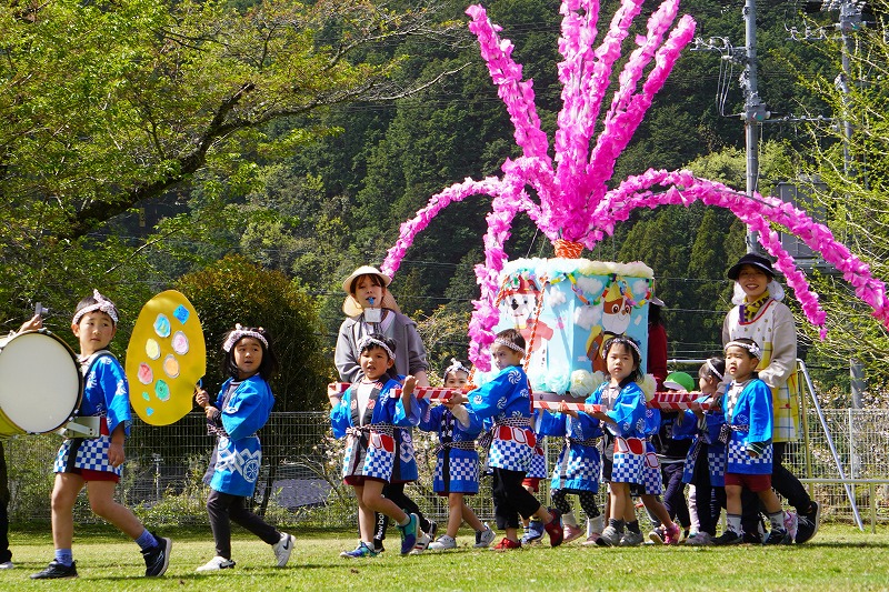 ワッショイの掛け声と、太鼓や笛の音が運動場に響き渡りました。子ども達は法被にねじり鉢巻きで、運動場を何周も練り歩きました。