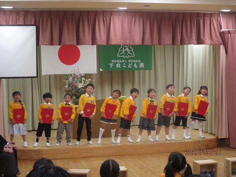 下牧こども園へ通ってくれてありがとう!自分を大切に仲間を大切に家族を大切に…大きく羽ばたいて下さい。ご卒園おめでとうございます。