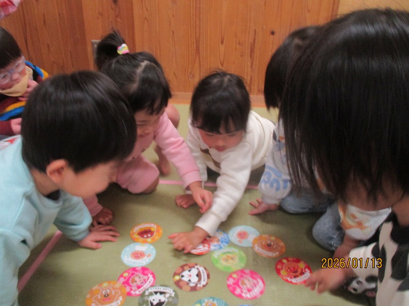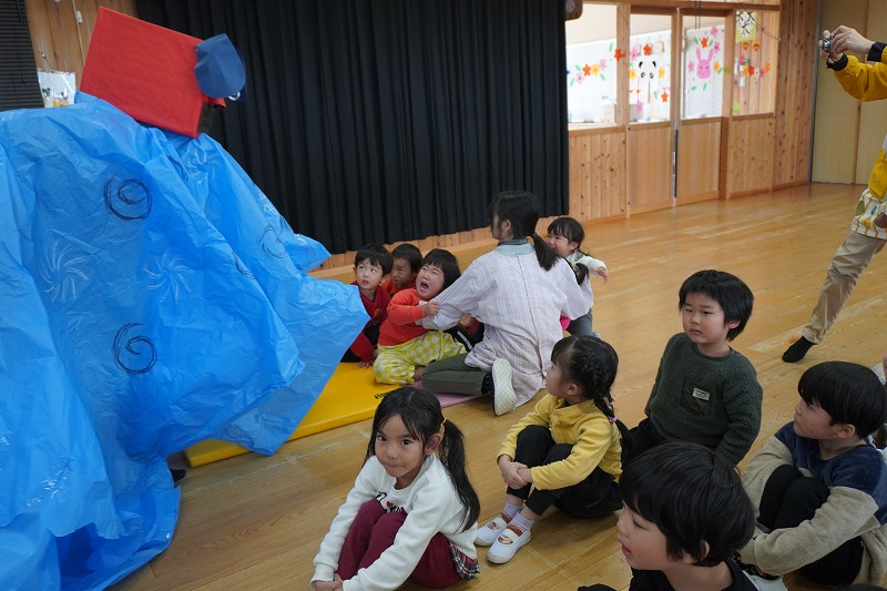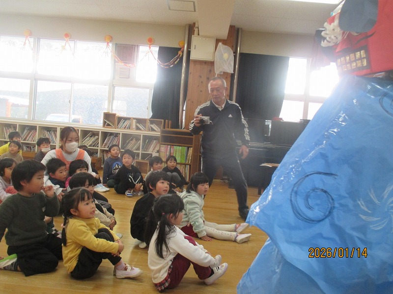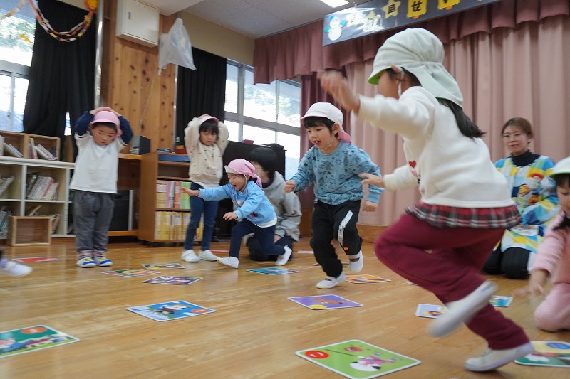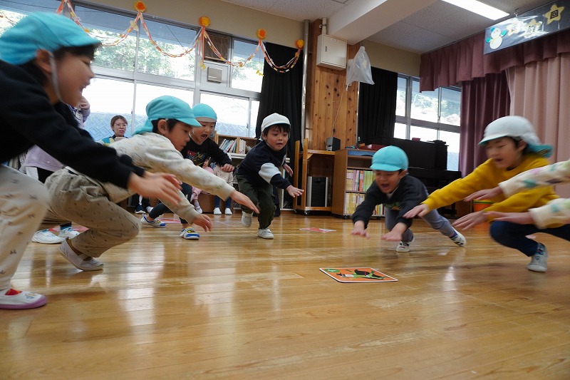 誕生会で先生から、お正月の話や獅子舞の話を聞いた子ども達。すると獅子舞が登場。「なに?」「なんかこわい?」突然の登場に子ども達もビックリでした。かるた会では、チーム戦で大きなかるた取りを楽しみました。