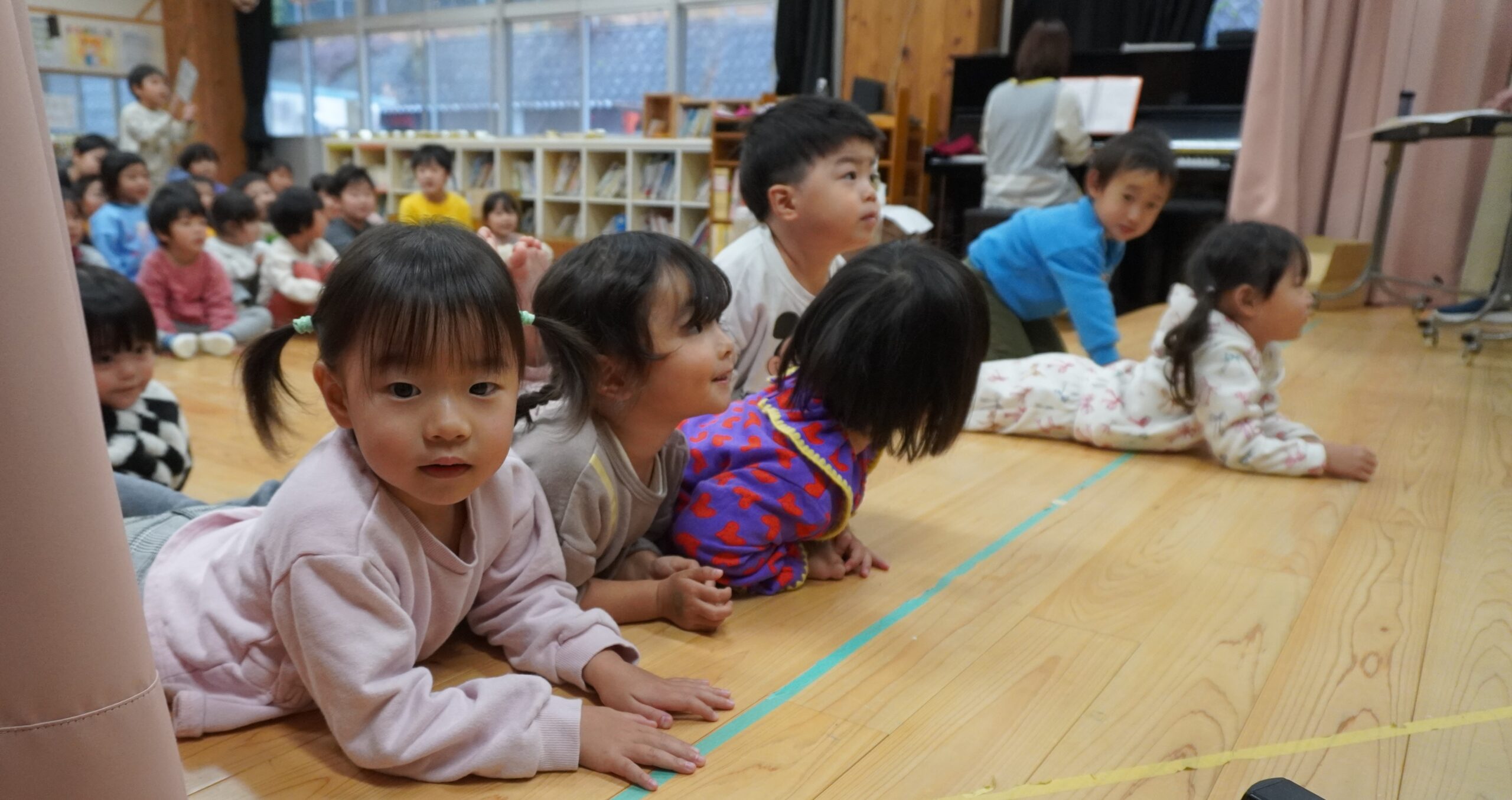今日が今年の保育納めとなりました。昨日は園でもクリスマス会を、保育士も子どもと一緒になって盛り上げ楽しみました。写真は、保育士たちからのプレゼント公演です。グループ名は「ヨーコーズ」です。ひよこ組さんたちは、ステージにどんどん近づいてかぶりつきで興味津々。以上児の子たちは目をキラキラさせて「赤鼻のトナカイさん」を演奏に合わせて大合唱でした。アンコール!アンコール!アンコールコールの中で「赤鼻のトナカイさん」の演奏が3回繰り返されました。初めての公園でしたが「ヨーコーズ」はたくさんのファンを獲得したみたいでした。特に、リーダーようこのドラム演奏(木魚、鉄琴、小太鼓、大太鼓、シンバル)の乱れうちにあこがれたみたいです。