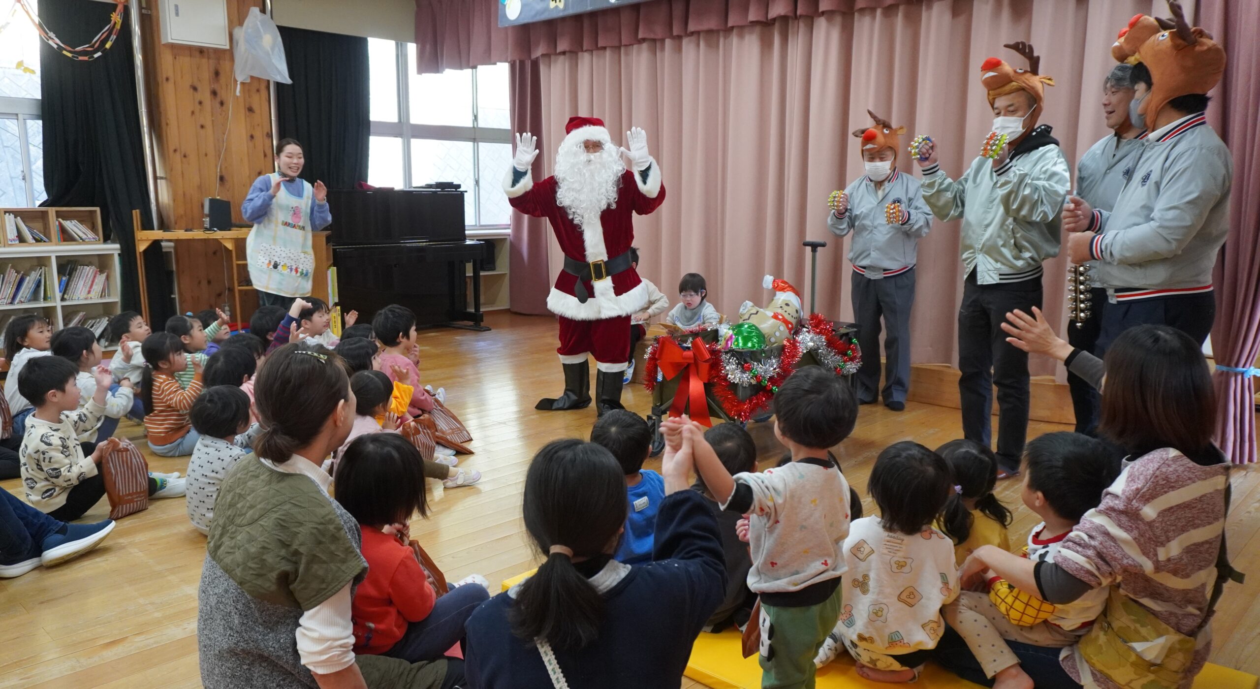 12月の誕生会を行っていました。なんと!その場に突然、サンタと4匹のトナカイが現れたのです。最初は不思議そうな顔を見せていた子どもの顔が、たちまち笑顔に彩られていくのが分かりました。その時、一人の男の子が立ってサンタさんに質問をしました。「サンタさんはその車(プレゼントが入っていたキャリアカー)で来たんですか?」「そうだよ。でもね、最初はソリで来たんだけど、下牧まで来たら雪がなかったんだ。そのままだとトナカイたちがソリを引くのが大変で疲れちゃうのは分かるよね。だから、タイヤに変えて来たんだよ。」と、とっさの質問にもサンタさんが答えてくれました。男の子とサンタさんとの問答には、子どもたちも先生たちも笑いが止まりませんでした。「あわてんぼうのサンタ軍団の皆さん(美濃市ライオンズクラブの皆様)」、このように子どもたちの夢とワクワクを広げる楽しい時間になったことに、心より御礼申し上げます。